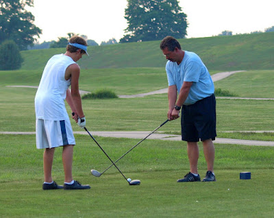 -Kevin Byron matched his Dad, Junior, with a gross score of 40 but had a few more handicap strokes, 8 to be exact. Each of them came in under par - Kevin at 26 net leads the tournament after the first nine holes, three strokes up on Tracy Rayhill, 4 up on Dennis Brosmer, Doug Denson, John Drake, Terry Padgett and Greg Potts.